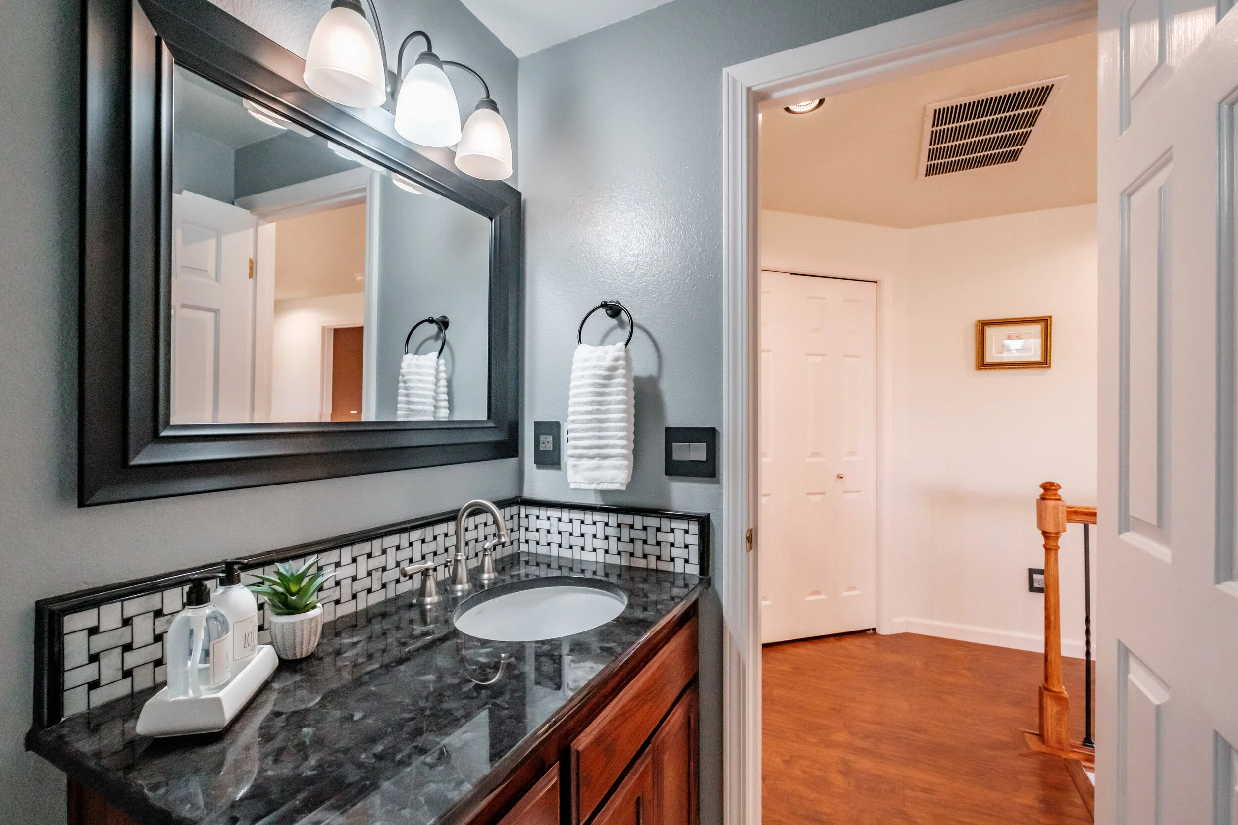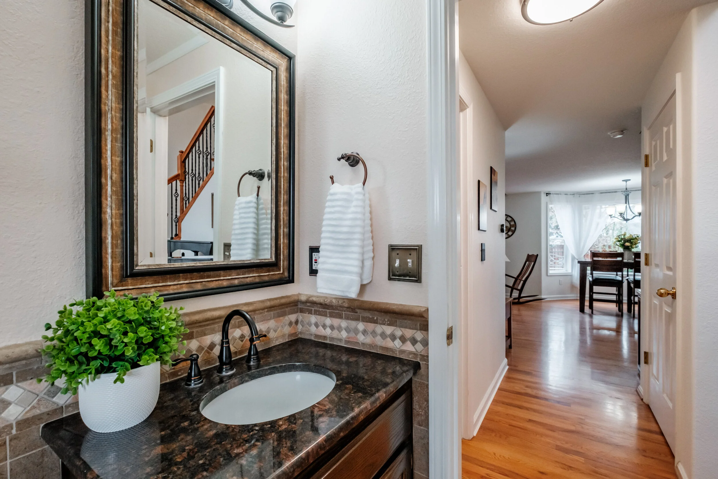 Shared full bathroom and half bathroom have marble countertop and tile
